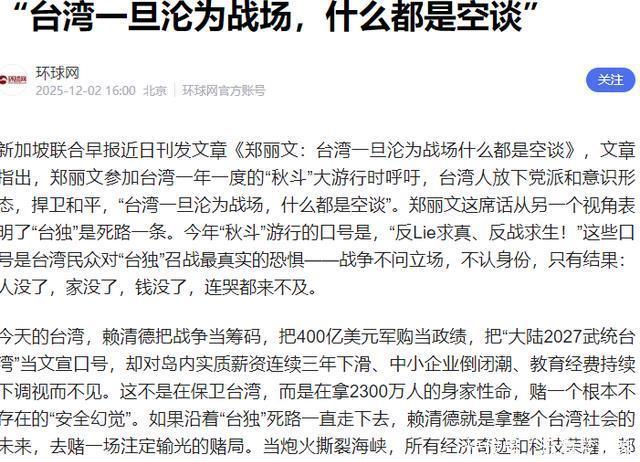 更打脸的是国民党副主席萧旭岑翻出的“旧账”:如今民进党激烈反对的“我是中国人”“一国两区”说法,其实是蔡英文2002年担任“陆委会主委”时就说过的话。当年蔡英文还参与炮制“两国论”,配合陈水扁的“一边一国”言论,如今却反过来指责国民党“亲中”,这种双重标准彻底暴露了民进党操弄意识形态的本质。 郑丽文在游行中呼吁“放下党派和意识形态”,正是戳中了问题的要害——当政治算计凌驾于民众安危之上,再昂贵的导弹也护不住台湾的和平。